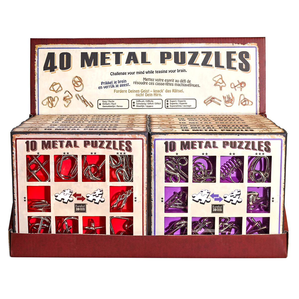 Scheid de onderdelen en breng ze terug naar de beginpositie. 1x 3 sterren*** moeilijkheidsgraad. 4x 2 sterren** moeilijkheidsgraad. 5x 1 ster* moeilijkheidsgraad. Elke set bevat een spiraalpuzzel, spijkerpuzzel, kleine gegoten puzzel, enz.