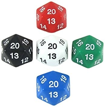 De opvolgende getallen zitten naast elkaar. Hierdoor zijn deze dobbelstenen zeer geschikt om de stand per speler bij te houden. Dit kan van hoog naar laag (levens) of van laag naar hoog (punten). Deze dobbelsteen hebben 20 vlakken en een grootte van 30mm.