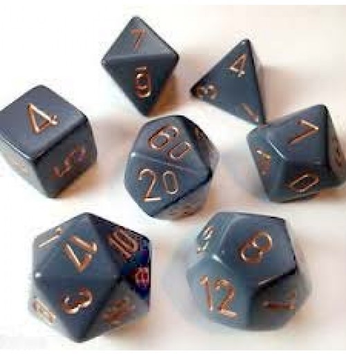 De Dark Grey Copper Opaque Polyhedral 7 Dice Set straalt industriële elegantie uit. Met een combinatie van donkergrijs en koper voegt deze set een krachtige en verfijnde uitstraling toe aan je tafelsp...