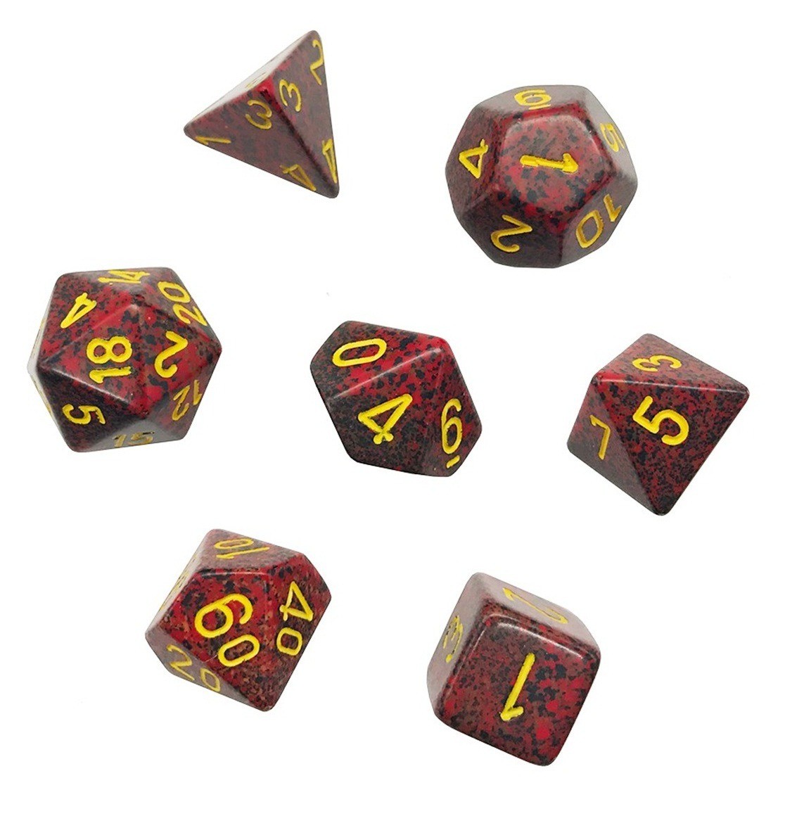 Set van 7 polydice Elke set bevat telkens één exemplaar van volgende maten: d20, d12, d10, d10 (percentielen), d8, d6 en d4