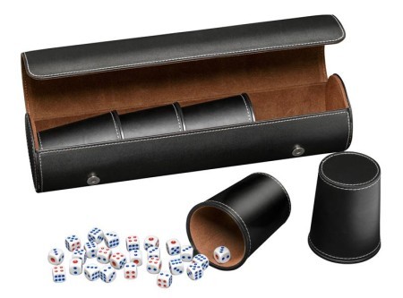 Dobbelbeker Kunstleer Zwart - PHI-7995 : Set van 5 dobbelbekers van zwarte kunstleer met deksel, incl. 25 dobbelstenen.