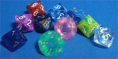 Ruim assortiment aan verschillende kleuren dobbelstenen met 10 zijden.