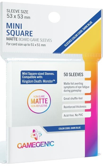 Deze bordspelsleeves (53x53mm) bieden een hoogwaardige bescherming voor bordspelkaarten tot 51x51 mm en bevatten een matte laminering (non-glare). Geschikt voor onder andere Kingdom Death Monster.