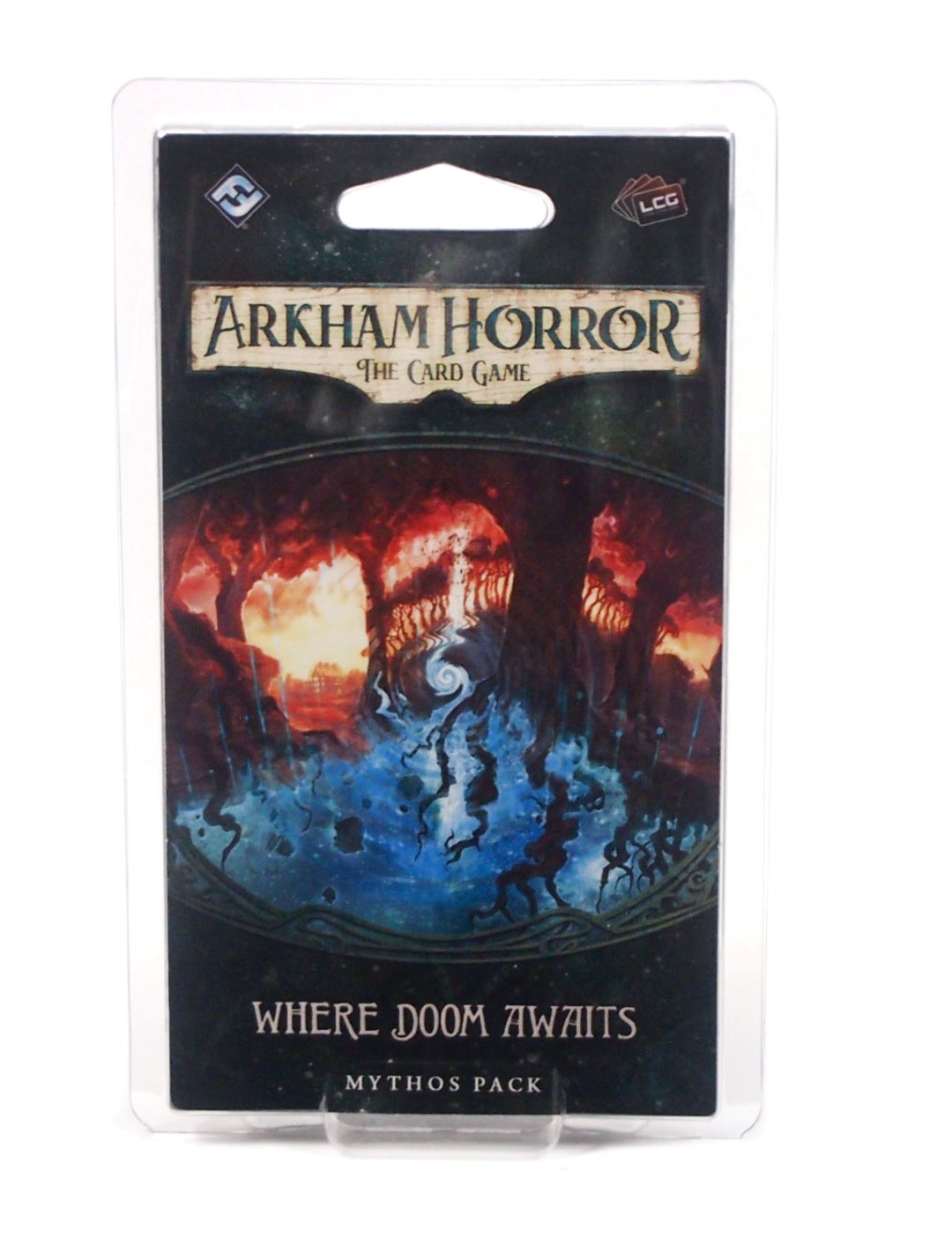 Where Doom Awaits is the fifth Mythos Pack in The Dunwich Legacy cycle for Arkham Horror: The Card Game. Even as its new scenario carries your investigations rapidly toward their climactic conclusion, it dizzies your investigator with a distorted version of reality. The woods outside of Dunwich are changing. You'll find clearings strewn with blood and bodies, rivers frozen solid despite the temperate air, and paths that rip open, revealing chasms through the dimensions and other worlds elsewhere in the void…