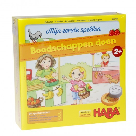 De dobbelsteen bepaalt telkens aan welke marktkraam gewinkeld mag worden,Daarnaast kunnen de kinderen ook vrij met het speelmateriaal