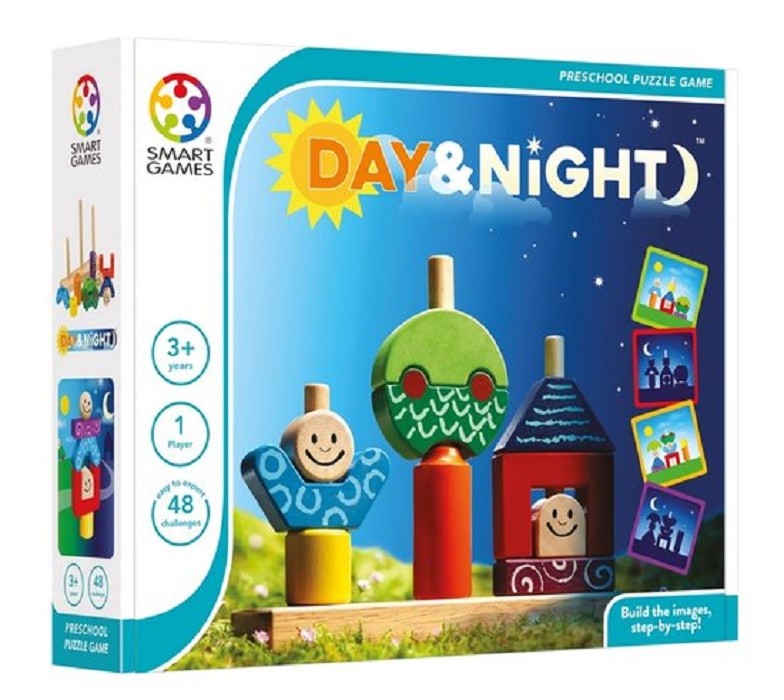 Zoals de nacht op de dag volgt, zo worden de 24 "dag"-opdrachten opgevolgd door de 24 moeilijkere "nacht"-opdrachten. Hierdoor is "Dag & Nacht" geschikt voor kinderen vanaf 3 jaar maar ook voor oudere kinderen. Materiaal: hout.