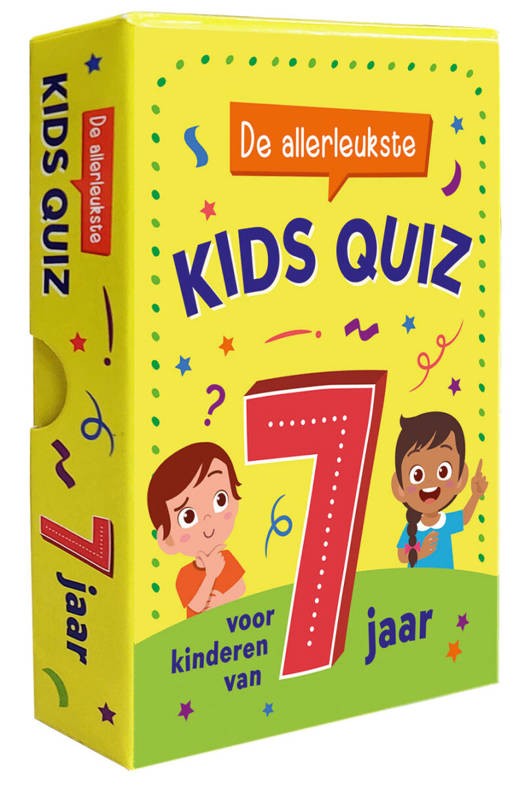 Een superleuke doos met 50 kleurrijke kaarten waarop meer dan 150 quizvragen staan! Ze werden speciaal voor kinderen van 7 jaar bedacht en handelen over de meest uiteenlopende onderwerpen zoals natuur, dieren, dagelijks leven, sport, vrije tijd en nog veel meer. Hoe heet de sneeuwman uit de film ‘Frozen’? Hoe noem je iemand die een ruimtevaart maakt? Bij welke sport doe je schoolslag? Test je kennis met deze en nog een heleboel andere vragen en word een echte puzzelkampioen!