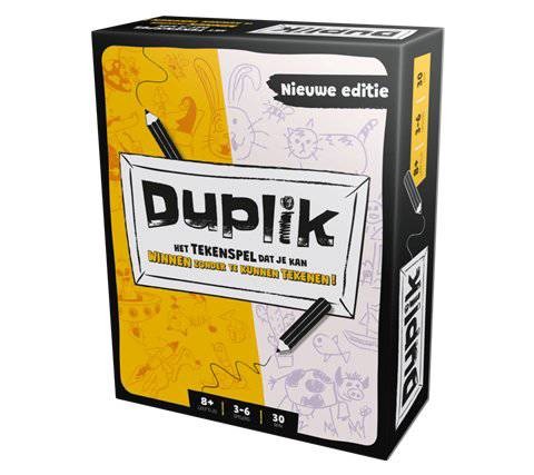 Duplik, het tekenspel waarbij je kunt winnen zonder te kunnen tekenen! Kun jij tekenen wat je hoort? Bij Duplik hoeft je tekening niet mooi te zijn, zolang hij maar de juiste details bevat! Eén speler beschrijft een grappige of gekke tekening, de anderen proberen deze zo goed mogelijk na te bootsen in 90 seconden zonder de tekening te zien. Vervolgens worden er punten toegekend op basis van geheime criteria! Hoe beter je luistert en hoe beter je de details nabootst, hoe meer punten je scoort. Zelfs met een tekening kun je winnen, zolang de details maar kloppen! Maar de verteller moet deze details natuurlijk wel vermelden.