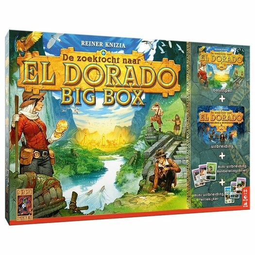 Als expeditieleider ga je op zoek naar El Dorado, de mysterieuze stad van goud. Tijdens je reis moet je je een weg banen door de jungle, kolkende rivieren oversteken en onderhandelen met lokale stammen. Wie als eerste het eindpunt bereikt, wint het spel. Deze grote doos bevat naast het basisspel “De Zoektocht naar El Dorado” 2 mini-uitbreidingen met 6 verschillende extra expeditiekaarten, en de uitbreiding “Helden & Demonen”. Deze grote uitbreiding biedt nieuwe avonturen tijdens de zoektocht naar El Dorado. Kortom, met deze Big Box kun je “De Zoektocht naar El Dorado” oneindig variëren en biedt elk afzonderlijk spel volledig verschillende uitdagingen!