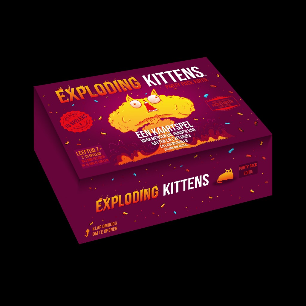 De Exploding Kittens Party Pack bevat een selectie van (vernieuwde) kaarten uit de reeks Exploding Kittens kaartspellen, waardoor het spel nu met maximaal 10 spelers te spelen is. Ideaal voor tijdens een feestje!