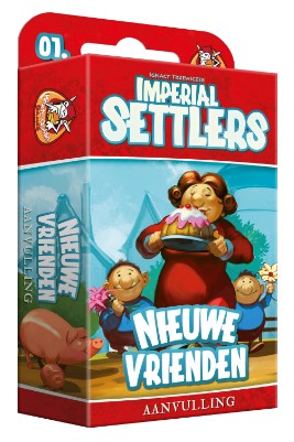 Imperial Settlers: Nieuwe Vrienden is een aanvulling op Imperial Settlers, Deze aanvulling bevat 55 nieuwe kaarten, die je kunt toevoegen aan het basisspel. Stel je eigen volkdeck samen, aangepast aan jouw strategie en manier van spelen. Nieuw zijn de “Open productie” locaties. Gebouwen in jouw rijk, leveren andere spelers goederen op en jou extra arbeiders. Ook nieuw zijn de “Productie/voordeel” locaties. Je bewaart goederen op dit gebouw voor de volgende ronde en scoor hiervoor ook nog eens punten in de volgende productiefase. En nog meer nieuw: de “Direct effect” kaarten: Een nieuw type kaart, waarmee je tijdens je beurt een nieuwe actie kunt uitvoeren. Voor speler die graag alleen spelen zijn er twee kaarten voor de solovariant toegevoegd die de virtuele speler nieuwe mogelijkheden geven.