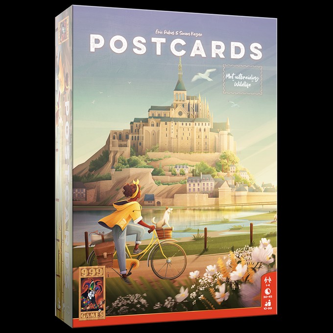Postcards is een vrolijk bordspel waarin je op je fiets door 13 kleurrijke regio’s racet, op zoek naar de mooiste ansichtkaarten en unieke souvenirs. Zet tactisch je kamp op, plak postzegels, en deel als eerste je avonturen met het thuisfront. Elke ansichtkaart levert je punten en cadeaus op. Door je routes goed te plannen word jij misschien wel de beste reiziger van de regio! Postcards zit boordevol slimme keuzes, vrolijke illustraties en een flink gevoel van avontuur!
