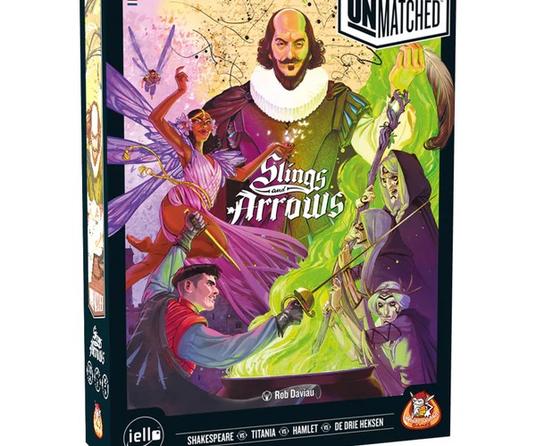 Unmatched: Slings & Arrows is de nieuwste editie van Unmatched, een asymmetrisch miniatuur gevechtsspel die een unieke spelervaring biedt voor twee of vier spelers. In deze variant verandert Shakespeare’s wereldberoemde Globe Theater in een strijdtoernooi voor gevechten waaraan William Shakespeare zelf deelneemt. Hij neemt het op tegen een aantal van zijn wonderbaarlijke personages: De Drie Heksen, Hamlet en Titania.