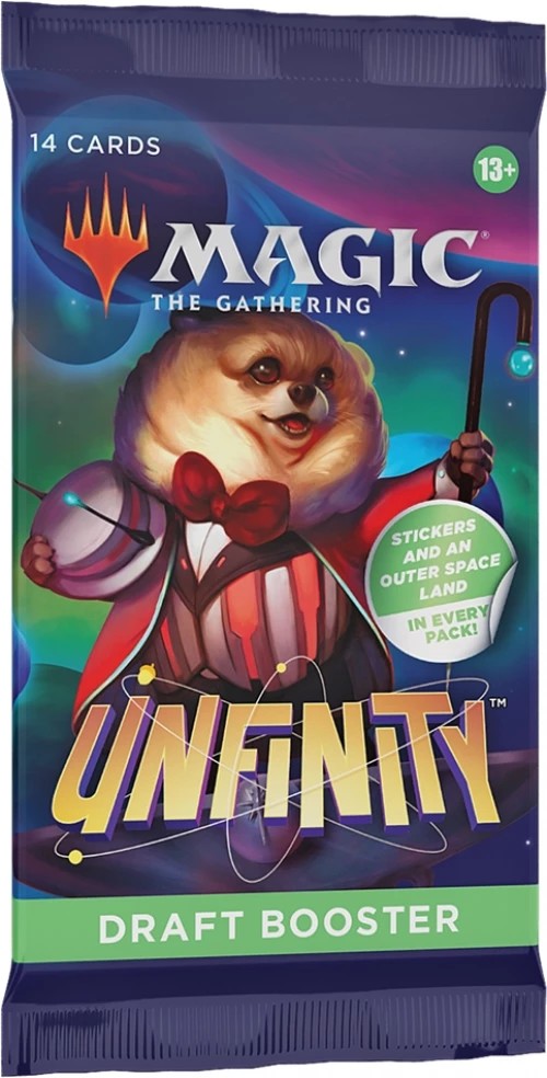 It's Magic in space with loads of retro-futuristic fun. Unfinity celebrates stretching Magic's mechanics with new characters, laughs, and beautiful science fiction-themed full-art shock lands. Each booster contains 14 Cards + 1 Sticker and 1 Token Card.