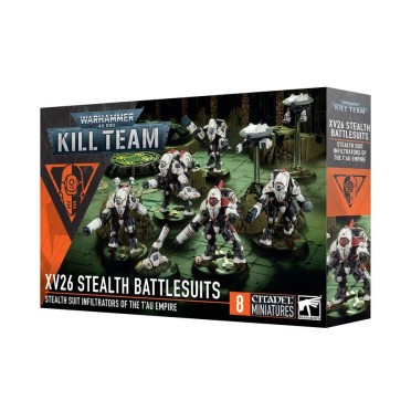 This multipart plastic kit builds eight XV26 Stealth Battlesuits operatives. These miniatures can be used as chameleonic XV26 Stealth Battlesuits warriors in games of Kill Team, or fielded in a T'au Empire army in games of Warhammer 40,000. The kit includes options, accessories, and different heads to customise your kill team, plus components to build specialists like the signal-jamming Neutraliser, camouflaged Infiltrator, maverick Lodestar, and more.