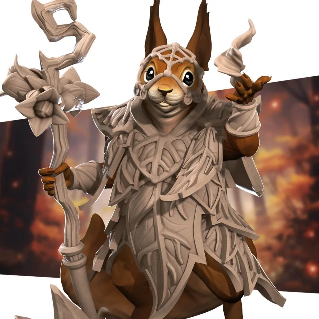 Quick-witted and full of energy, the Squirrel Sorceress wields magic as lively as her spirit. With spells that sparkle and crackle like a lightning storm, she casts with a mischievous flair, bringing a burst of wild energy to every encounter