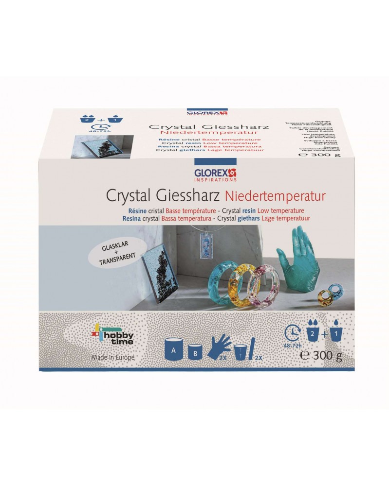 De hoogwaardige Crystal giethars voor lage temperaturen is zeer geschikt voor het produceren van kristalheldere gietstukken. Dankzij de hoge vloeibaarheid kan het gietharsmengsel zonder problemen in de mal en de hoeken worden gegoten. Het resultaat ziet eruit als glas, maar is zeer stabiel. Door de lage temperatuurvariatie kunnen bijvoorbeeld gedroogde bloemen worden ingegoten of foto's worden gespiegeld zonder dat ze hun kleur verliezen door de hitte die kan optreden tijdens het zetproces. Het kleuren van giethars is ook mogelijk met Glorex giethars kleuren. De “Crystal Giethars lage temperatuur” is zeer geschikt voor de nieuwe siliconen mallen van Glorex.