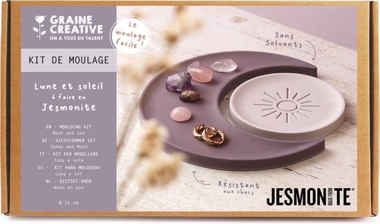Met deze set maak je unieke Jesmonite bakjes in de vorm van een maan en een zon die precies in elkaar passen. Jesmonite is een milieuvriendelijke watergedragen hars en wordt veel gebruikt voor het gieten van prachtige en unieke projecten, van sieraden tot schaaltjes, van tafelbladen tot onderzetters. Het is veilig in gebruik en bevat geen schadelijke chemicaliën. Deze kit bevat alles wat je nodig hebt om met Jesmonite te beginnen, inclusief pigmenten, herbruikbare siliconen vormen en stapsgewijze instructies die je door alle stappen leiden.