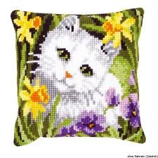 Kruissteekkussen kit witte poes in narcissen