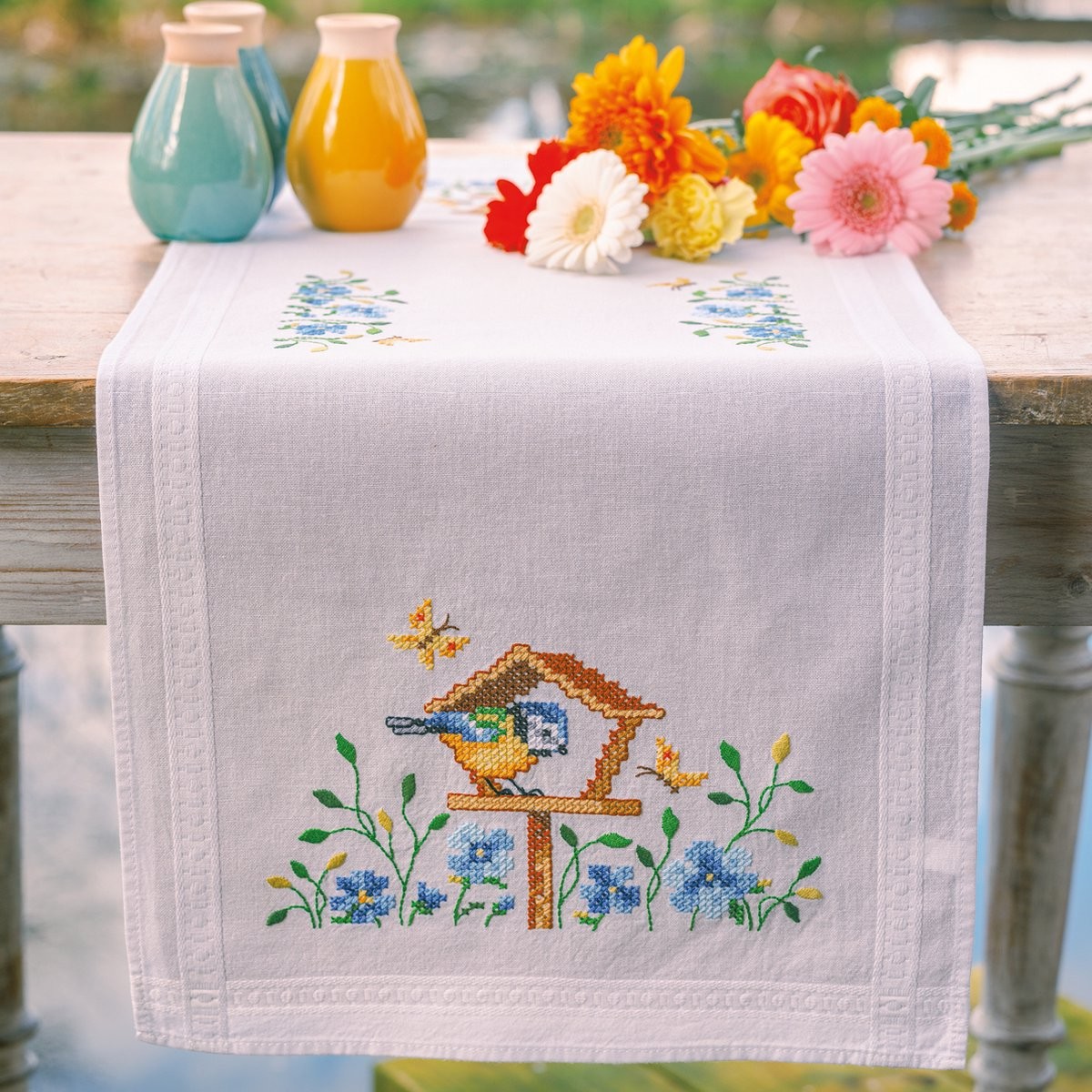 Vervaco tafelloper borduren vogelhuisjes PN-0148131 voorbedrukt, dit borduurpakket is ook verkrijgbaar in een tafelkleed.
