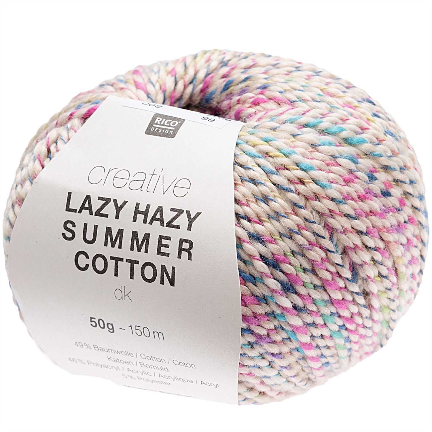 Het Creative Lazy Hazy Summer Cotton-garen heeft een basiskleur die omwikkeld is met een bedrukte draad, waardoor een gedraaid garen ontstaat waarmee je leuke kledingstukken en accessoires kunt breien. Het veelzijdige kleurenpalet varieert van pasteltinten tot levendige kleuren.