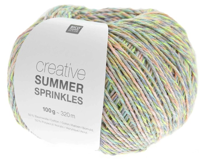 Creative Summer Sprinkles is een speelse en kleurrijke collectie garen, perfect voor het breien of haken van vrolijke zomerprojecten. Het garen is voorzien van kleine, contrasterende kleurvlekken die doen denken aan de levendigheid van zomerse sprinkles op ijsjes. Deze levendige spikkels voegen een leuke en jeugdige uitstraling toe aan je handgemaakte creaties.