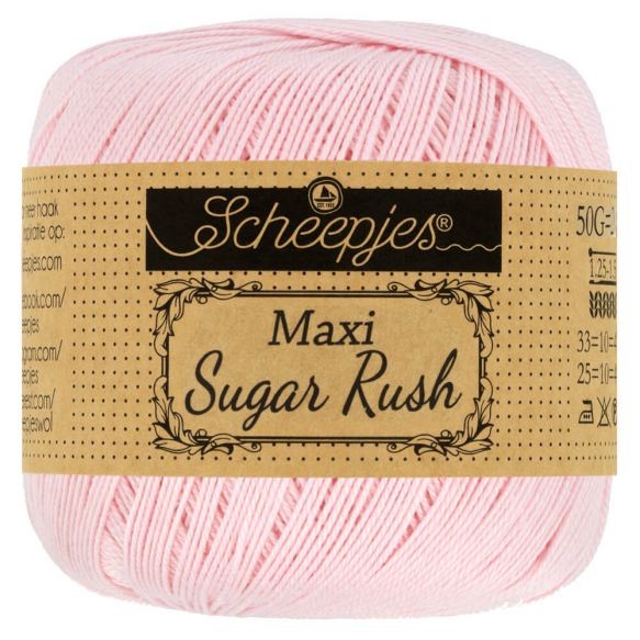 Scheepjes Maxi Sugar Rush is evenals Scheepjes Maxi Sweet Treat een zeer fijn (garendikte Lace) gemerceriseerd garen van 100% katoen. Scheepjes Maxi Sugar Rush heeft een subtiel glansje en een sterk getwijnde draad, waardoor het brei- of haakwerk een fraaie gladde afwerking krijgt. Dit fijne garen is ideaal voor opengewerkte brei- of haakpatronen, zoals ajourbreien, kantbreien of filethaakwerk, maar natuurlijk ook voor luchtige kleding of accessoires. Bij de productie is gebruikgemaakt van een volledig biologische afvalwaterzuivering, waardoor het gebruikte water op een veilige manier wordt gerecycled en hergebruikt. Scheepjes Maxi, Maxi Sugar Rush en Maxi Sweet Treat zijn identieke garens, maar elk met een andere looplengte. Scheepjes Maxi Sugar Rush heeft het EN 71-3 keurmerk, wat aangeeft dat dit garen veilig is in gebruik voor personen met een gevoelige huid en met name veilig voor speelgoed voor baby's en kinderen. Dat maakt dit garen tot een veilige keus voor bijvoorbeeld babydekentjes, knuffels of amigurumi. Scheepjes Maxi Sugar Rush is verkrijgbaar in een uitgebreid palet aan schitterende kleuren. De aanbevolen naalddikte is 1.25-1.50mm. Een bol weegt 50 gram en heeft een looplengte van 280 meter.