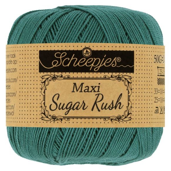 Scheepjes Maxi Sugar Rush is evenals Scheepjes Maxi Sweet Treat een zeer fijn (garendikte Lace) gemerceriseerd garen van 100% katoen. Scheepjes Maxi Sugar Rush heeft een subtiel glansje en een sterk getwijnde draad, waardoor het brei- of haakwerk een fraaie gladde afwerking krijgt. Dit fijne garen is ideaal voor opengewerkte brei- of haakpatronen, zoals ajourbreien, kantbreien of filethaakwerk, maar natuurlijk ook voor luchtige kleding of accessoires. Bij de productie is gebruikgemaakt van een volledig biologische afvalwaterzuivering, waardoor het gebruikte water op een veilige manier wordt gerecycled en hergebruikt. Scheepjes Maxi, Maxi Sugar Rush en Maxi Sweet Treat zijn identieke garens, maar elk met een andere looplengte. Scheepjes Maxi Sugar Rush heeft het EN 71-3 keurmerk, wat aangeeft dat dit garen veilig is in gebruik voor personen met een gevoelige huid en met name veilig voor speelgoed voor baby's en kinderen. Dat maakt dit garen tot een veilige keus voor bijvoorbeeld babydekentjes, knuffels of amigurumi. Scheepjes Maxi Sugar Rush is verkrijgbaar in een uitgebreid palet aan schitterende kleuren. De aanbevolen naalddikte is 1.25-1.50mm. Een bol weegt 50 gram en heeft een looplengte van 280 meter.