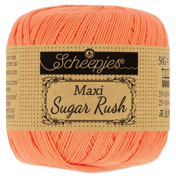 Scheepjes Maxi Sugar Rush is evenals Scheepjes Maxi Sweet Treat een zeer fijn (garendikte Lace) gemerceriseerd garen van 100% katoen. Scheepjes Maxi Sugar Rush heeft een subtiel glansje en een sterk getwijnde draad, waardoor het brei- of haakwerk een fraaie gladde afwerking krijgt. Dit fijne garen is ideaal voor opengewerkte brei- of haakpatronen, zoals ajourbreien, kantbreien of filethaakwerk, maar natuurlijk ook voor luchtige kleding of accessoires. Bij de productie is gebruikgemaakt van een volledig biologische afvalwaterzuivering, waardoor het gebruikte water op een veilige manier wordt gerecycled en hergebruikt. Scheepjes Maxi, Maxi Sugar Rush en Maxi Sweet Treat zijn identieke garens, maar elk met een andere looplengte. Scheepjes Maxi Sugar Rush heeft het EN 71-3 keurmerk, wat aangeeft dat dit garen veilig is in gebruik voor personen met een gevoelige huid en met name veilig voor speelgoed voor baby's en kinderen. Dat maakt dit garen tot een veilige keus voor bijvoorbeeld babydekentjes, knuffels of amigurumi. Scheepjes Maxi Sugar Rush is verkrijgbaar in een uitgebreid palet aan schitterende kleuren. De aanbevolen naalddikte is 1.25-1.50mm. Een bol weegt 50 gram en heeft een looplengte van 280 meter.
