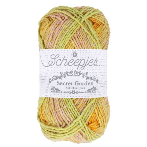 Ontdek Scheepjes Secret Garden, een zijdezacht garen met een markant uiterlijk. Dit garen is gemaakt van 20% zijde, 20% katoen en 60% polyester en is verkrijgbaar in een palet van betoverend mooie unikleuren en gemêleerde tinten. Scheepjes Secret Garden combineert de prachtige textuur van de natuurlijke zijdevezel met de zachtheid en ademende kwaliteit van katoen en de duurzaamheid van polyester. Dit garen is geschikt voor uiteenlopende brei- of haakprojecten, zoals kleding, modeaccessoires of woonaccessoires. De aanbevolen naalddikte is 4.00mm. Een bol Scheepjes Secret Garden weegt 50 gram en heeft een looplengte van 93 meter (garendikte DK).