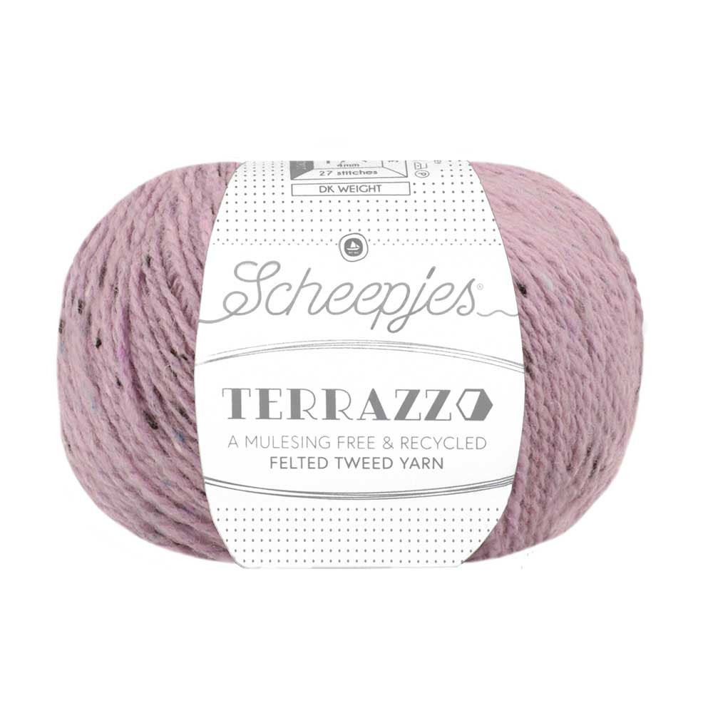 Scheepjes Terrazzo is een volledig gerecyclede wol-viscosemix met een luxe uitstraling en een subtiel gespikkeld kleureffect, dat doet denken aan terrazzo (granito) vloeren. Het gespikkelde effect wordt bewerkstelligd door de vezelpropjes in contrasterende en complementerende kleuren die in deze tweedwol zijn mee getwijnd. Scheepjes Terrazzo profiteert van de ademende kwaliteiten van zowel wol als viscose en combineert daarnaast het beste van die twee: dankzij de viscose voelt het garen zijdezacht aan, is het vocht absorberend, valt het mooi, heeft het een rustieke uitstraling en is het licht van gewicht, terwijl de wol het heerlijk warm maakt. Die combinatie maakt Terrazzo geschikt voor de meest uiteenlopende haak- en breiwerken: van kleding, zoals truien en vesten, tot mode- en woonaccessoires in allerlei vormen en maten. Het leent zich ook prima voor inbreiwerk en haken met meerdere kleuren en is bovendien heel mooi te combineren met Scheepjesgarens in andere texturen, zoals Alpaca Rhythm en Mohair Rhythm. Scheepjes Terrazzo is een Premium Blend tweedwol gemaakt van 70% gerecyclede wol en 30% gerecyclede viscose en is wasbaar tot 30 ᵒC. De geadviseerde naalddikte is 4.00mm (stekenverhouding: 27 steken x 35 naalden tricotsteek is 10 x 10cm). Verkrijgbaar in 60 kleuren, in bollen van 50 gram (looplengte 175 meter) en als colour pack met minibolletjes van 10 gram (looplengte 35 meter) in alle 60 kleuren.