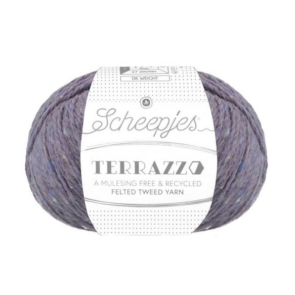 Scheepjes Terrazzo is een volledig gerecyclede wol-viscosemix met een luxe uitstraling en een subtiel gespikkeld kleureffect, dat doet denken aan terrazzo (granito) vloeren. Het gespikkelde effect wordt bewerkstelligd door de vezelpropjes in contrasterende en complementerende kleuren die in deze tweedwol zijn mee getwijnd. Scheepjes Terrazzo profiteert van de ademende kwaliteiten van zowel wol als viscose en combineert daarnaast het beste van die twee: dankzij de viscose voelt het garen zijdezacht aan, is het vocht absorberend, valt het mooi, heeft het een rustieke uitstraling en is het licht van gewicht, terwijl de wol het heerlijk warm maakt. Die combinatie maakt Terrazzo geschikt voor de meest uiteenlopende haak- en breiwerken: van kleding, zoals truien en vesten, tot mode- en woonaccessoires in allerlei vormen en maten. Het leent zich ook prima voor inbreiwerk en haken met meerdere kleuren en is bovendien heel mooi te combineren met Scheepjesgarens in andere texturen, zoals Alpaca Rhythm en Mohair Rhythm. Scheepjes Terrazzo is een Premium Blend tweedwol gemaakt van 70% gerecyclede wol en 30% gerecyclede viscose en is wasbaar tot 30 ᵒC. De geadviseerde naalddikte is 4.00mm (stekenverhouding: 27 steken x 35 naalden tricotsteek is 10 x 10cm). Verkrijgbaar in 60 kleuren, in bollen van 50 gram (looplengte 175 meter) en als colour pack met minibolletjes van 10 gram (looplengte 35 meter) in alle 60 kleuren.