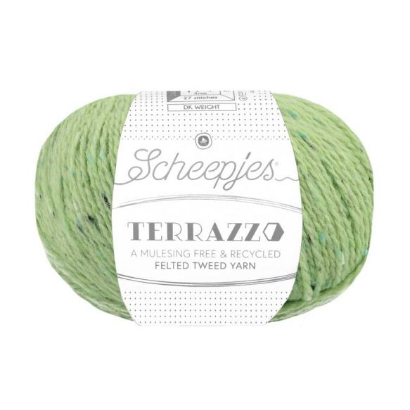 Scheepjes Terrazzo is een volledig gerecyclede wol-viscosemix met een luxe uitstraling en een subtiel gespikkeld kleureffect, dat doet denken aan terrazzo (granito) vloeren. Het gespikkelde effect wordt bewerkstelligd door de vezelpropjes in contrasterende en complementerende kleuren die in deze tweedwol zijn mee getwijnd. Scheepjes Terrazzo profiteert van de ademende kwaliteiten van zowel wol als viscose en combineert daarnaast het beste van die twee: dankzij de viscose voelt het garen zijdezacht aan, is het vocht absorberend, valt het mooi, heeft het een rustieke uitstraling en is het licht van gewicht, terwijl de wol het heerlijk warm maakt. Die combinatie maakt Terrazzo geschikt voor de meest uiteenlopende haak- en breiwerken: van kleding, zoals truien en vesten, tot mode- en woonaccessoires in allerlei vormen en maten. Het leent zich ook prima voor inbreiwerk en haken met meerdere kleuren en is bovendien heel mooi te combineren met Scheepjesgarens in andere texturen, zoals Alpaca Rhythm en Mohair Rhythm. Scheepjes Terrazzo is een Premium Blend tweedwol gemaakt van 70% gerecyclede wol en 30% gerecyclede viscose en is wasbaar tot 30 ᵒC. De geadviseerde naalddikte is 4.00mm (stekenverhouding: 27 steken x 35 naalden tricotsteek is 10 x 10cm). Verkrijgbaar in 60 kleuren, in bollen van 50 gram (looplengte 175 meter) en als colour pack met minibolletjes van 10 gram (looplengte 35 meter) in alle 60 kleuren.
