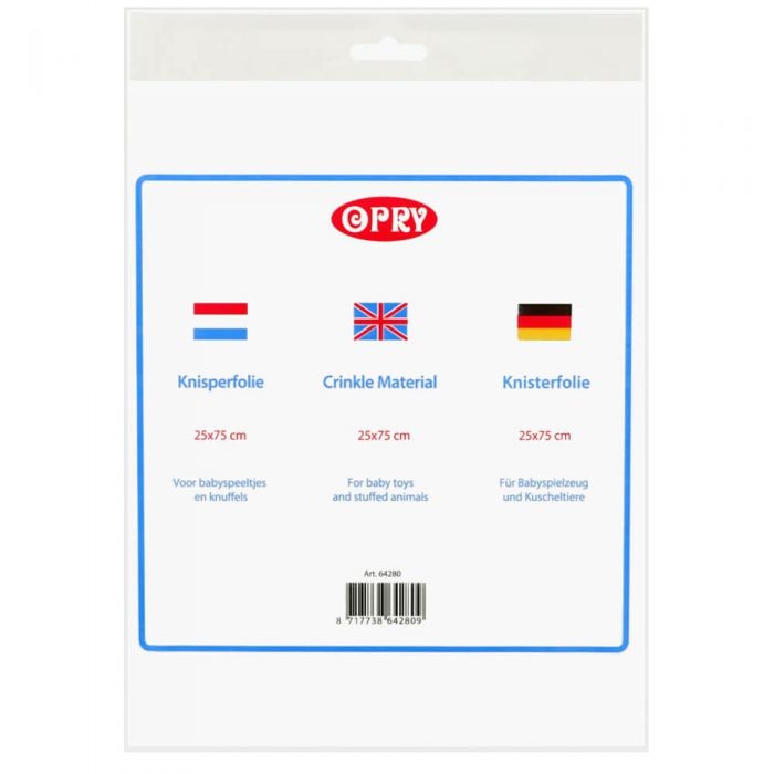 Plaats het Opry knisperfolie in speelgoed voor baby’s en in kinderboeken en doekjes om een stimulerend geluid toe te voegen. Het knisperfolie meet 25 x 75cm