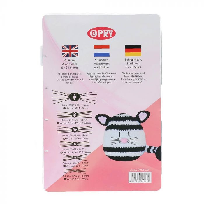 Geef een zelfgemaakte amigurumi of dierenknuffel een eigen karakter en authentieke uitstraling met deze zwarte snorharen. De snorren zijn te combineren met een kunststof dierenneus en bestaan uit een plaatje met aan weerskanten 5 zwarte snorharen. Leg voor bevestiging de snor tussen stof/breisel en neus, steek vervolgens het schroefdraad (aan de achterkant neus) door het middelste gat van de bevestigingsplaat (snor) en de stof of het breisel en zet die aan de binnenkant van de amigurumi of knuffel vast met een sluitring. Voor extra stevigheid kunnen de snorharen nog worden vastgenaaid.