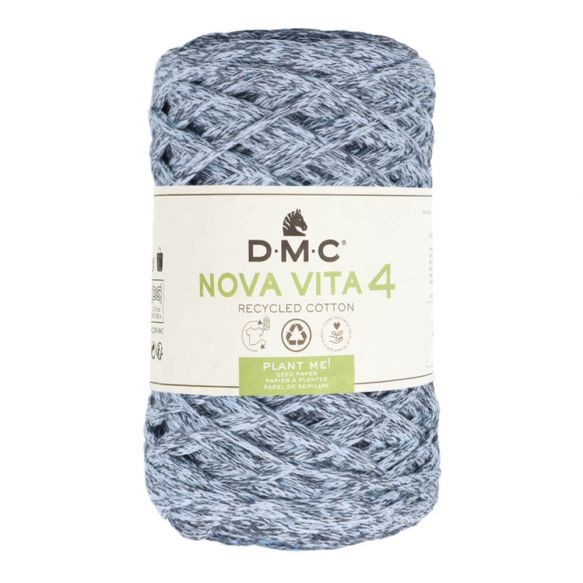 Het nieuwe garen Nova Vita nr. 4 van DMC is net als het dikkere Nova Vita nr. 12 gemaakt van gerecycled textiel. Dat is goed voor het milieu en geeft u bovendien de gelegenheid om nog meer leuke woon- en modeaccessoires te maken. Nova Vita wordt gemaakt van textielafval dat gemalen, geverfd en opnieuw wordt gesponnen. Daarnaast heeft het garen een gerecyclede verpakking en stopt u de banderol in de grond in plaats van die weg te gooien – de banderol is namelijk zaadpapier (of groeipapier) waarmee plantjes en dus nieuw leven kunnen worden gekweekt. Het koordgaren heeft een doorsnee van 2.50-3.00mm en bestaat uit een geweven omhulsel rond een dunnere draad die het zijn stevigheid geeft. Het is bij uitstek geschikt voor het haken, breien of macrameeën van woon- en modeaccessoires, zoals tassen, placemats, kussens, lampenkappen of plantenhangers. Verkrijgbaar in 12 unikleuren en als verloopgaren in 6 multicolour tinten. Nova Vita nr. 4 is samengesteld uit 80% gerecycled katoen en 20% polyester en heeft het OEKO-TEX® Standard 100 keurmerk. Wasbaar tot 30ᵒC. De aanbevolen naalddikte voor breien is 5.00mm en voor haken 4.00mm. Een bol Nova Vita nr. 4 weegt 250 gram en heeft een looplengte van 200 meter.