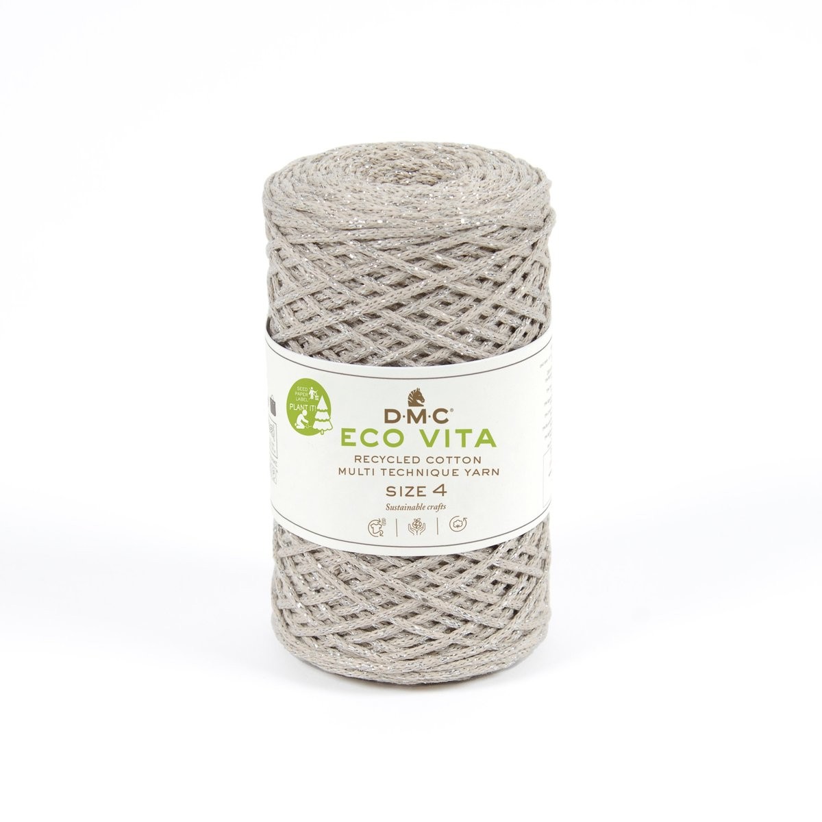Een 100% gerecycled garen gemaakt van textielafval. Eco Vita 4 Metallic Effect is een dik, buisvormig garen met een glans. Het is perfect voor macramé, breien of haken van woonaccessoires zoals manden, plantenbakken, kussens en lampenkappen. Deze combinatie van zilveren of gouden vezels, afhankelijk van de gekozen garenkleur, voegt het hele jaar door glans en een vleugje glamour toe aan je creaties. Zelfs het label is herbruikbaar! Plant het en laat je eigen tuin groeien.