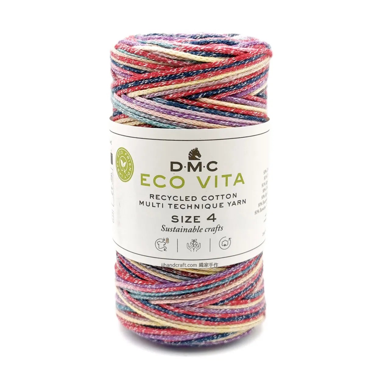 DMC Eco Vita 4 Multicolor is een meerkleurig garen met een kort kleurverloop van gerecycled textielafval bedoeld voor woondecoratie en tassen.