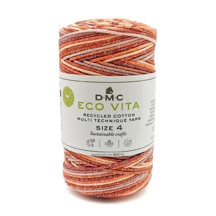 DMC Eco Vita 4 Multicolor is een meerkleurig garen met een kort kleurverloop van gerecycled textielafval bedoeld voor woondecoratie en tassen.