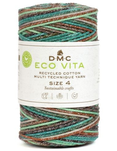 DMC Eco Vita 4 Multicolor is een meerkleurig garen met een kort kleurverloop van gerecycled textielafval bedoeld voor woondecoratie en tassen.