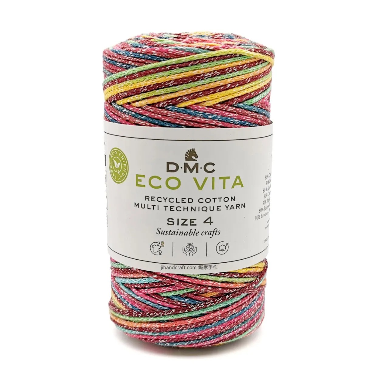 DMC Eco Vita 4 Multicolor is een meerkleurig garen met een kort kleurverloop van gerecycled textielafval bedoeld voor woondecoratie en tassen.