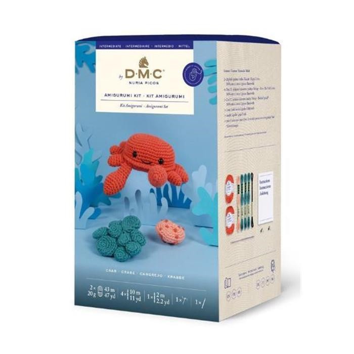 Complete set inclusief zacht, veelkleurig DMC-katoenen garen, bijpassende haaknaald en gedetailleerde instructies om een uniek knuffeldier in de vorm van een krab te maken.