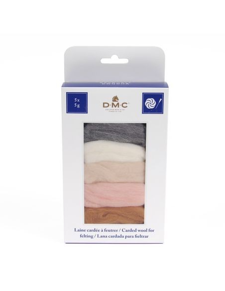 Laat je fantasie de vrije loop met dit pak gekaarde wol, speciaal ontworpen om te vilten. Elk pak bevat vijf bijpassende tinten van 5 gram per stuk, goed voor een totaal van 25 gram. Perfect om je originele ideeën tot leven te brengen of de patronen uit onze inspiratieboeken te volgen.