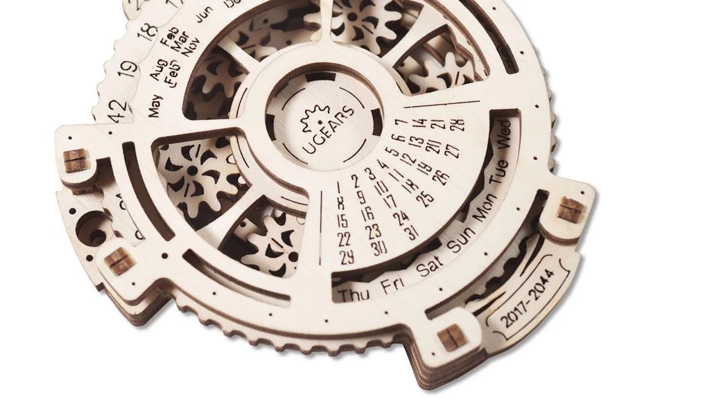 De Date Navigator 2.0 helpt bij het identificeren van de dag van de week voor elke datum van 2017 tot 2044. Het wordt gemonteerd zonder lijm, zoals alle UGEARS-modellen.