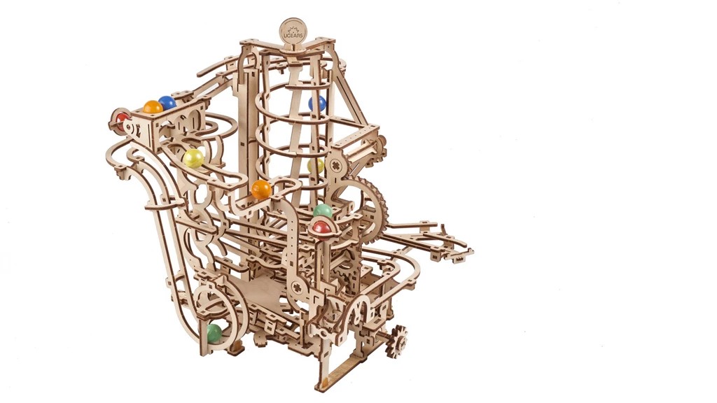 De Marble Run-spiraaltakel is het vierde model in de Ugears-collectie van fascinerende doe-het-zelf houten mechanische knikkerbanen. De takel heeft twee soorten rails om de opstijging te versnellen: de belangrijkste spiraalrails en verticale rails. Draai aan de zwengel om de gekleurde glazen knikkers naar boven te tillen (één knikker gaat omhoog per negen omwentelingen van de opwindende zwengel) naar de opslag voor drie knikkers bovenaan. Van daaruit beginnen de knikkers aan hun afdaling door spannende elementen: een snelle glijbaan, een verticale slang en een bergrivier.