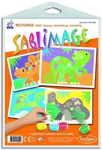 Navulling Dino’s 18×25cm is een creatieve zandkunst-navulling waarmee kinderen nieuwe dinosaurustekeningen kunnen maken door gekleurd zand op zelfklevende illustratievellen te strooien. De set bevat g...