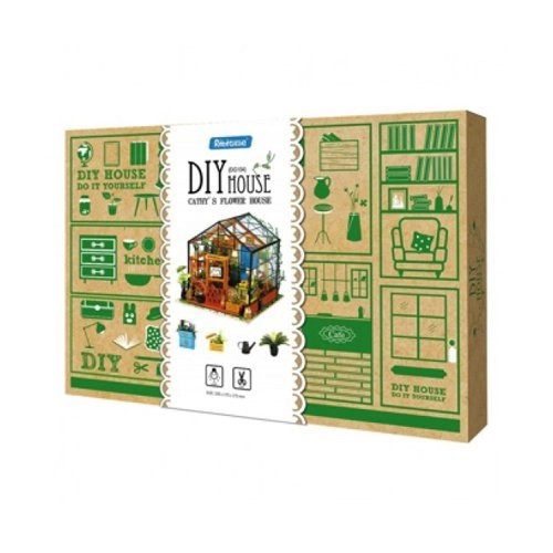 Je zet deze bloemenkas helemaal zelf in elkaar. Alle onderdelen van Cathy’s flower house zitten allemaal in de doos, inclusief de lijm en 2 knoop cel batterijen. De batterijen zijn nodig voor de verlichting die in Cathy’s flower house aanwezig is. Het hoofdmateriaal van dit bouwpakket bestaat uit hout, papier, plastic en metaal. Het enige wat je zelf nog mag pakken is een schaar en je kan gelijk starten.
