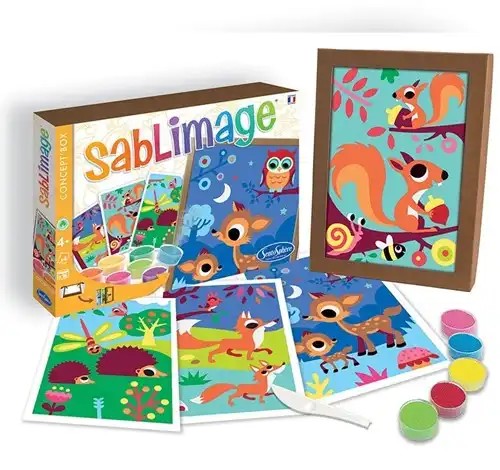Bosdieren is een creatieve zandkunstset waarmee kinderen hun eigen kleurrijke bosdierenkunst kunnen maken. Met behulp van gekleurd zand en voorgeprinte lijmvellen ontstaat stap voor stap een vrolijk kunstwerk. Deze knutselactiviteit stimuleert creativiteit, kleurgevoel en fijne motoriek bij kinderen vanaf ca.4 jaar.