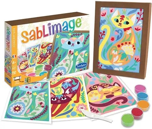 Sablimage Katten Romantiek is een creatieve zandkunstset waarmee kinderen hun eigen kleurrijke kattenkunstwerken kunnen maken. Met behulp van gekleurd zand en voorgeprinte lijmvellen ontstaat stap voor stap een vrolijk kunstwerk. Deze knutselactiviteit stimuleert creativiteit, kleurgevoel en fijne motoriek bij kinderen vanaf ca.?3?jaar.