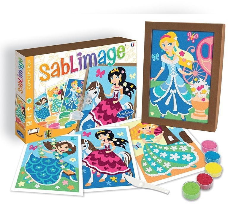 Sablimage Zandtekeningen Set Prinsessen stappen kinderen in een sprookjeswereld vol kleur en fantasie. De prachtige prinsessenillustraties worden met gekleurd zand tot leven gebracht op zelfklevende sjablonen, zonder gebruik van lijm. Laag voor laag ontstaan betoverende zandkunstwerken met een schitterend eindresultaat. Deze creatieve activiteit stimuleert concentratie, fijne motoriek en verbeeldingskracht en zorgt voor rustig en plezierig knutselplezier.